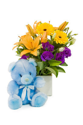 Hand picked fresh seasonal flowers displayed in Ceramic container with a soft toy - an ideal gift for the new born
