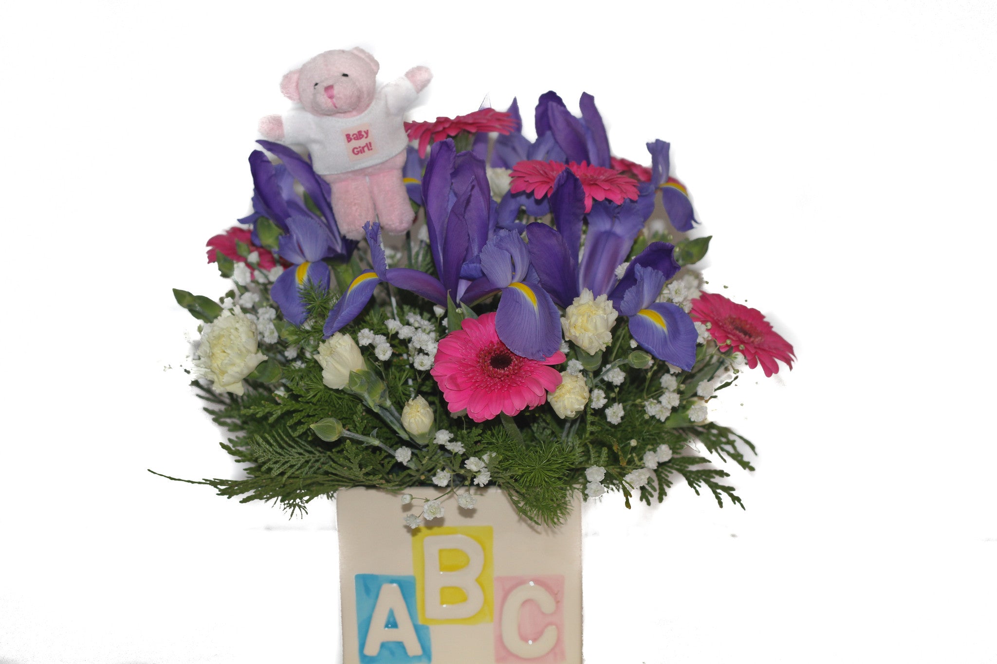 Bright colourful flowers hand selected to compliment either newborn baby boy or girl displayed in a keepsake ceramic container. Start the journey of life with wonderful memories.